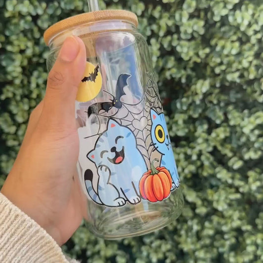 Spooky Cat Pumpkin Can Glass: Iced Coffee Tumbler with Bamboo Lid