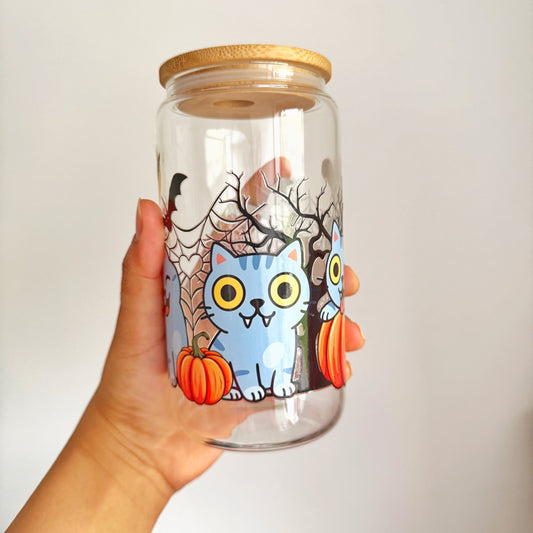 Spooky Cat Pumpkin Iced coffee Glass Can With Bamboo Lid and Straw