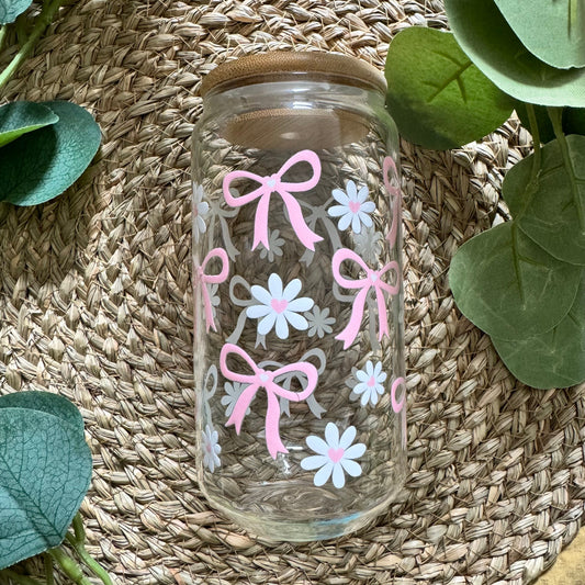 Couquette bow and daisy iced coffee can, Couquette Bow double walled cup, pink bow girly iced coffee can, bridesmaid party cups, bow cans