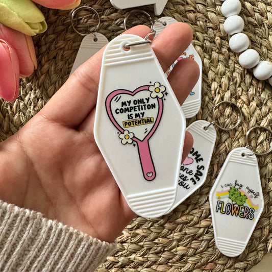Motel Keyrings in various designs suitable for gifting or yourself, Sarcastic keyring, love key ring, self respect keyring, coffee keyring