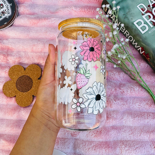 Floral Halloween Spooky Boo Iced Coffee Can Glass, Strawberry Spooky Coffee Tumbler with Bamboo Lid and starw