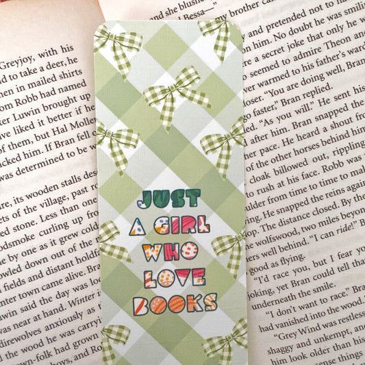 Just a Girl Who Loves Books Linen Bookmark – Green Checkered & Bow Bookish Bookmark for Readers