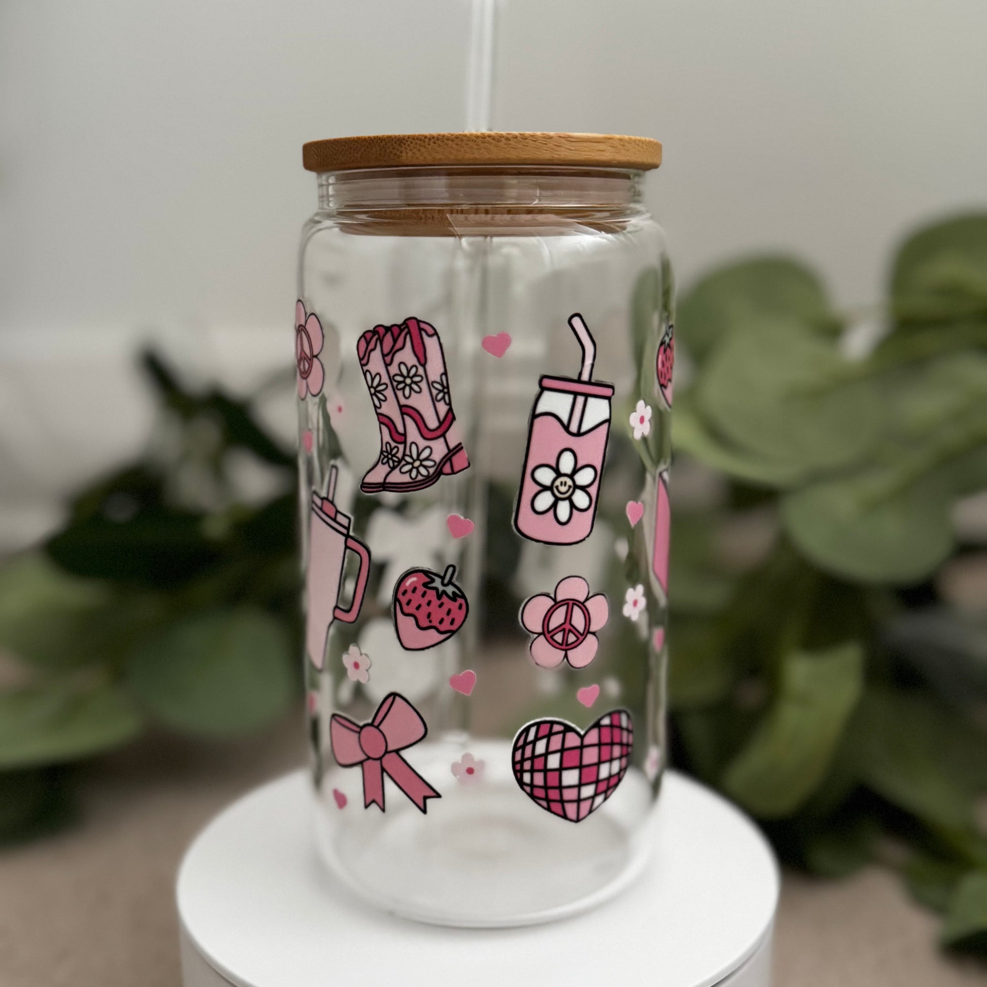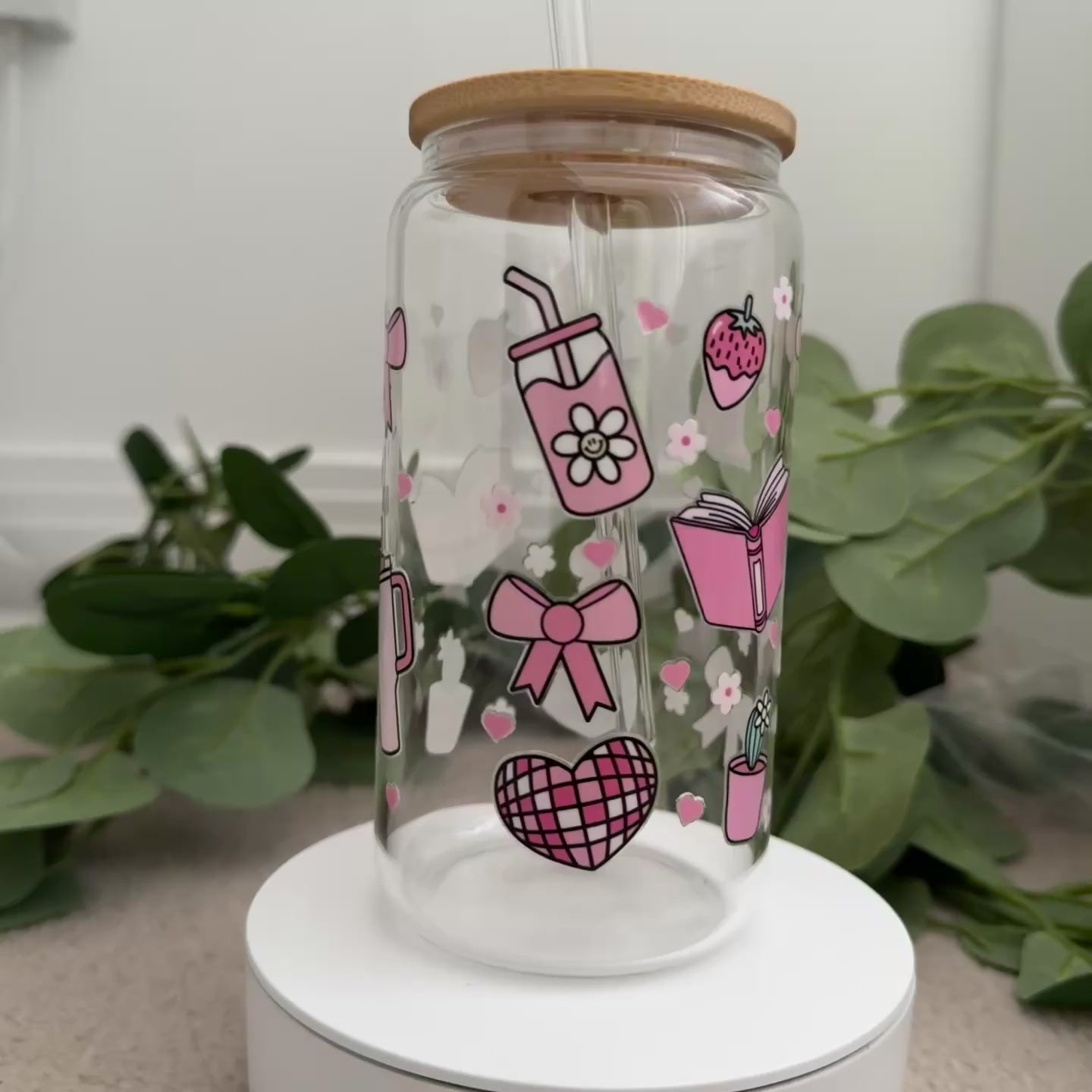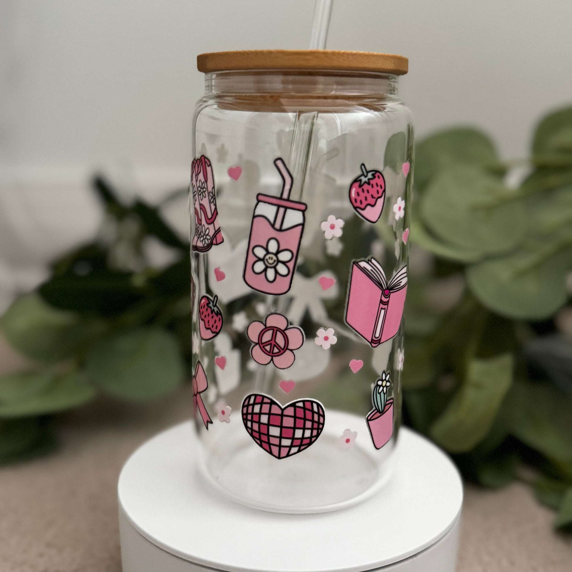 Bookish Pink lover iced coffee glass mug, Cute iced coffee glass bamboo lid and glass straw, Coffee book lovers cute bookish cup,Bookish glass 16oz