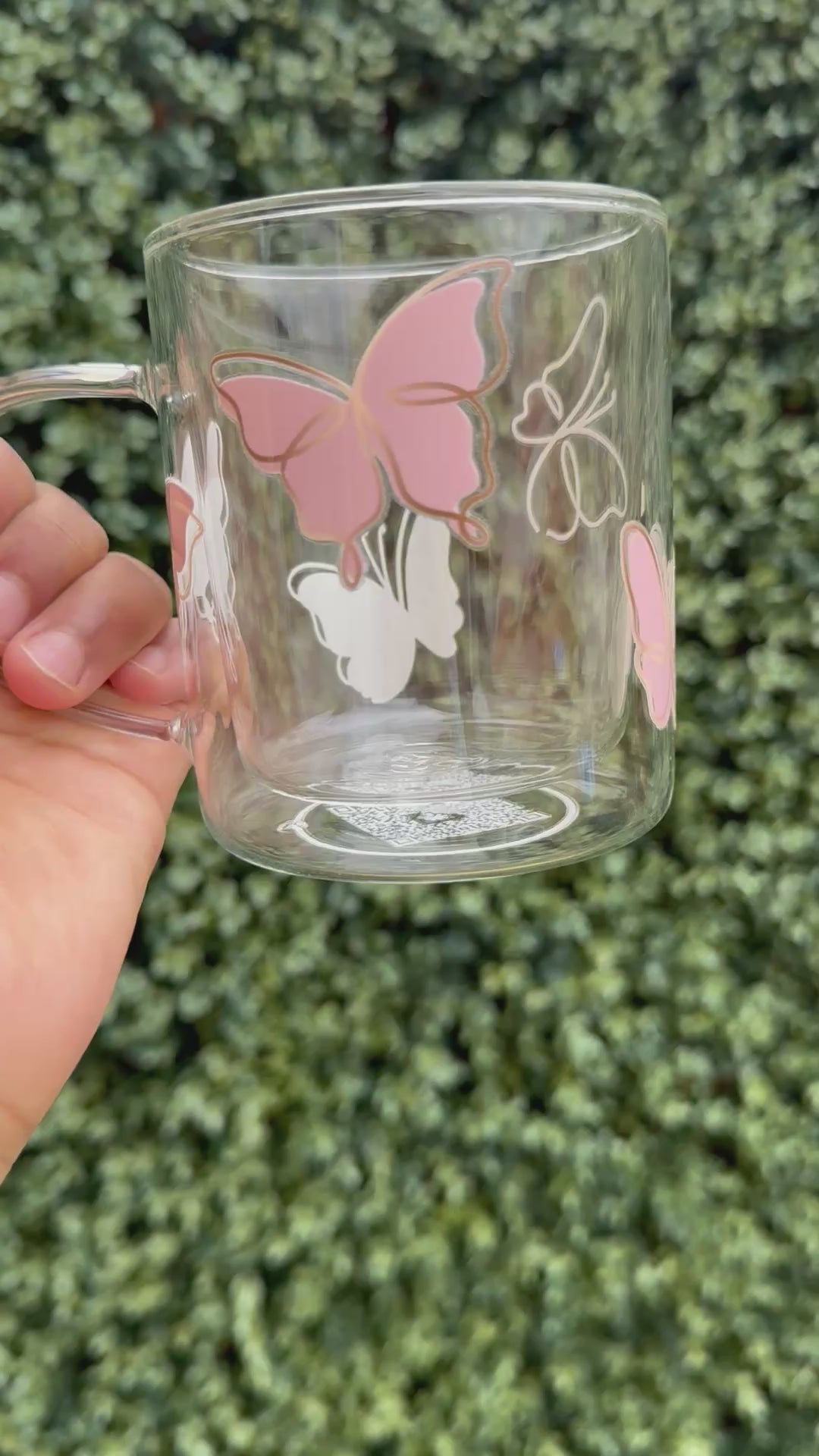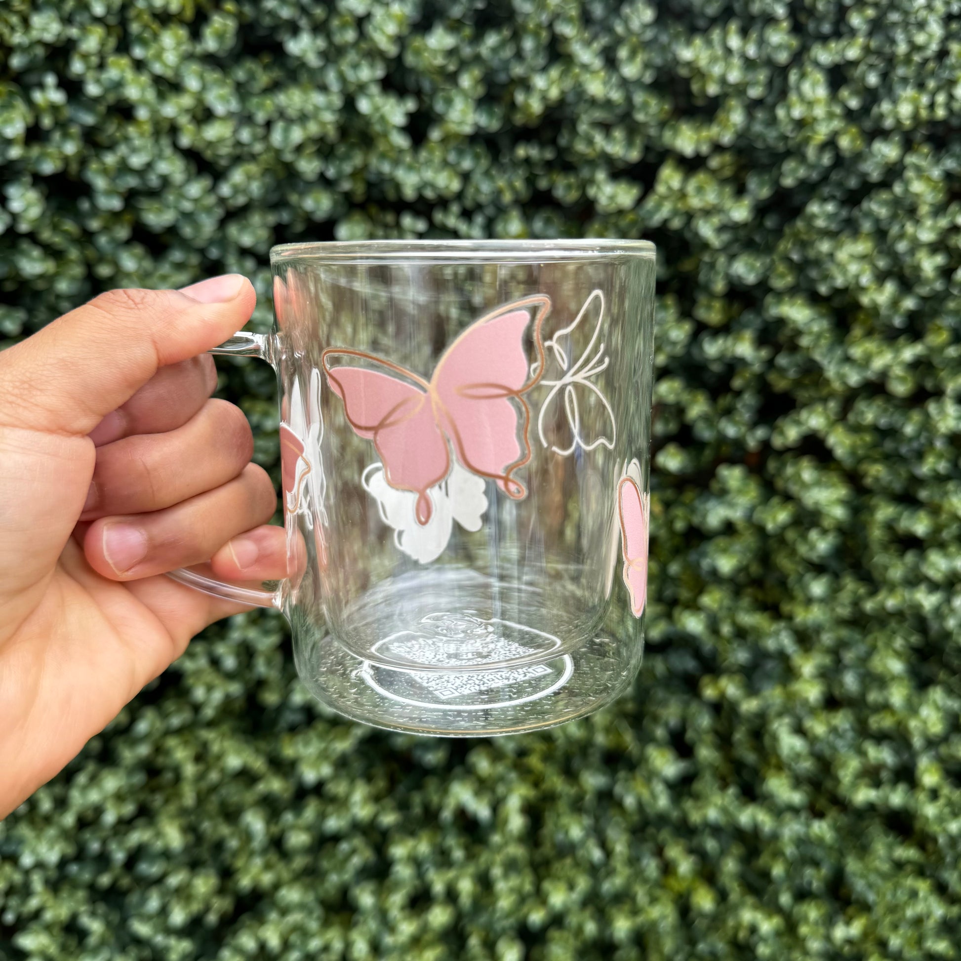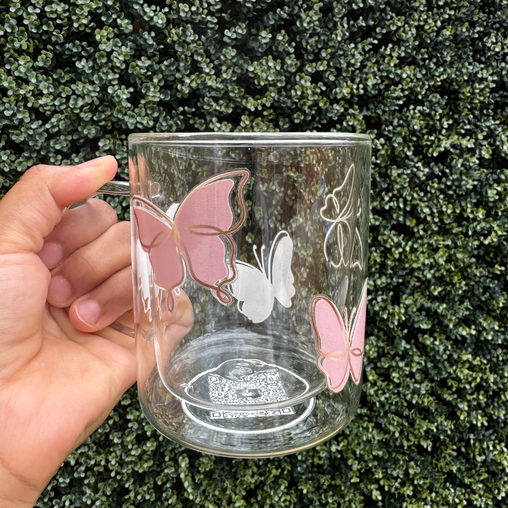 Butterfly glass coffee mug . Pink Girly mug. Glass mug .Gift for coffee lover .Butterfly mug 13oz Double walled