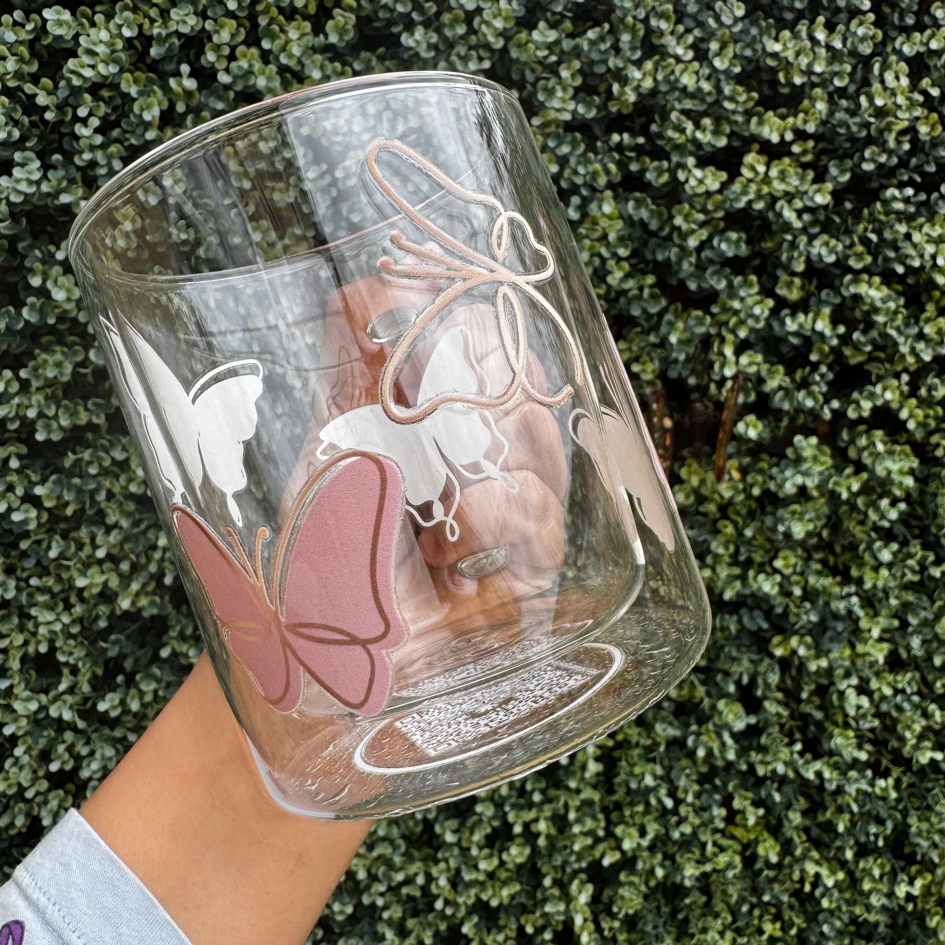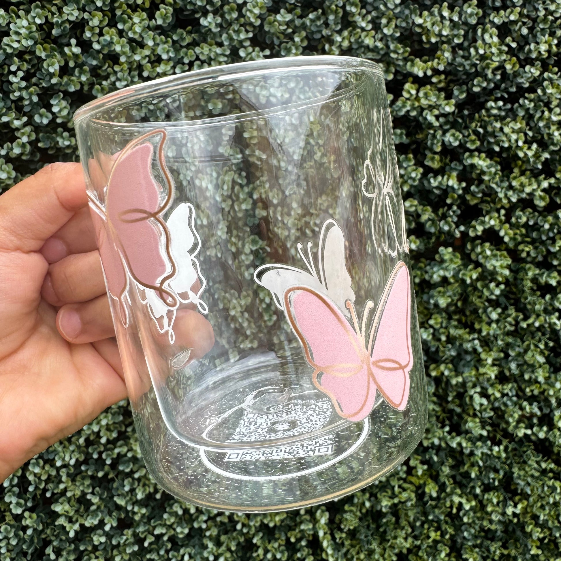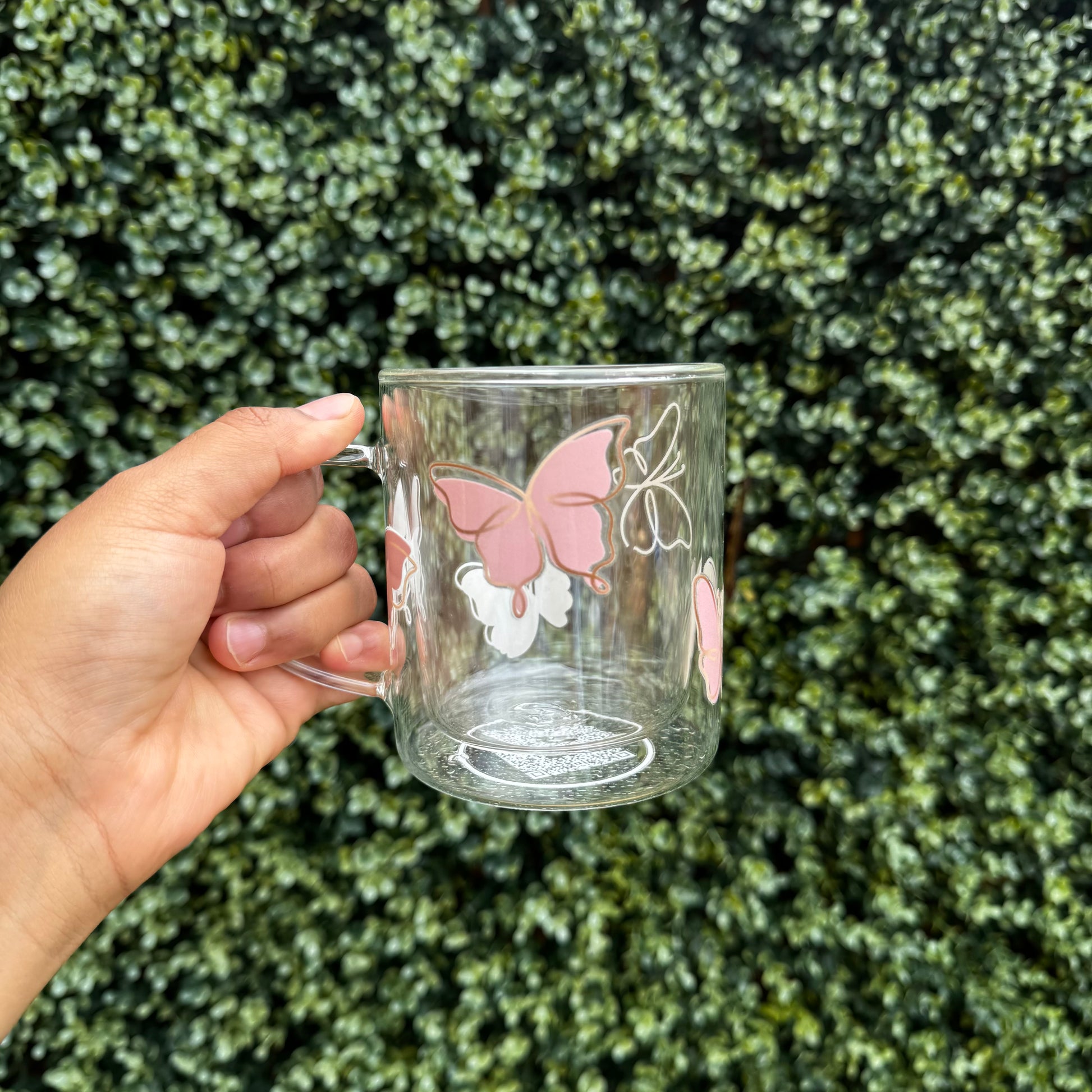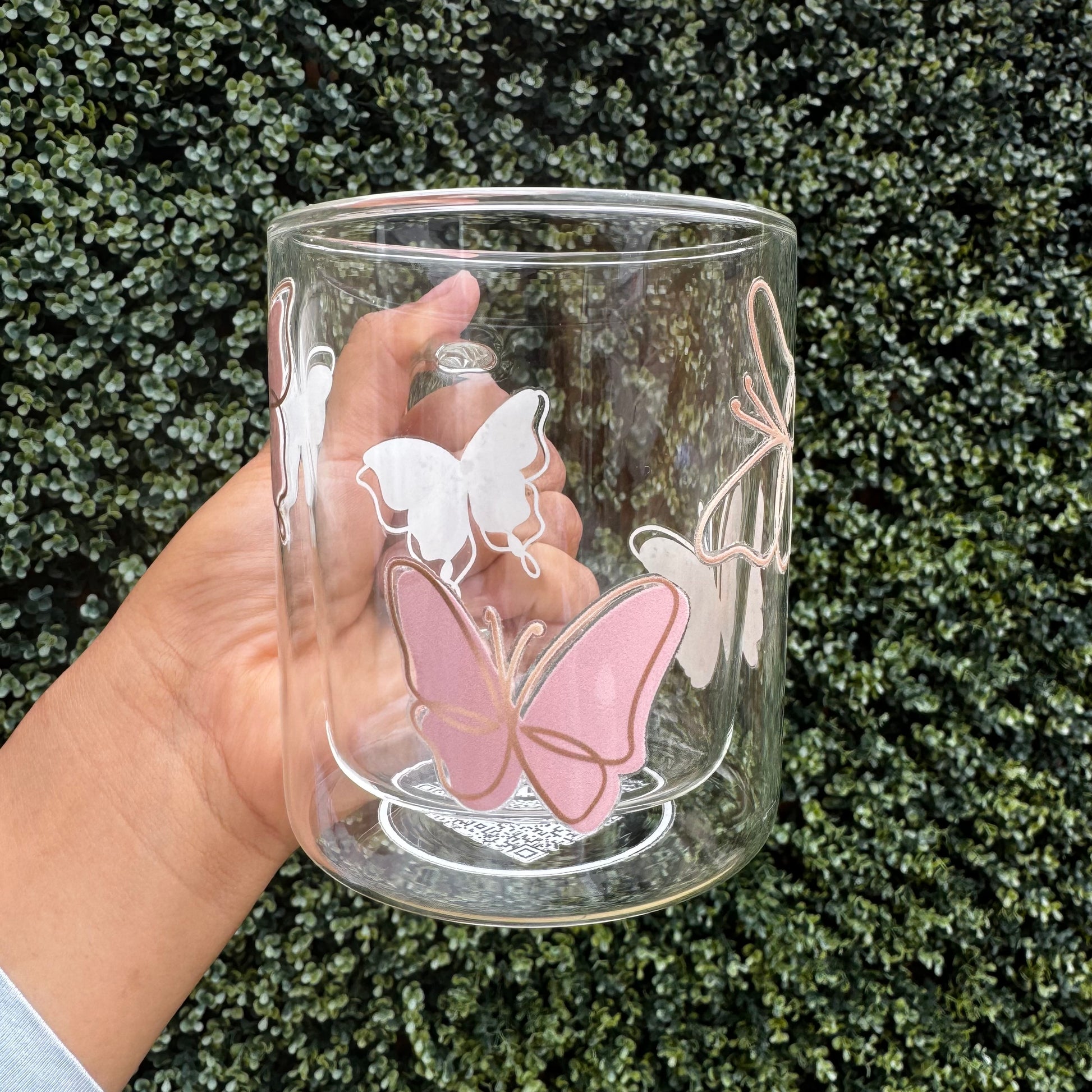 Butterfly glass coffee mug . Pink Girly mug. Glass mug .Gift for coffee lover .Butterfly mug 13oz Double walled