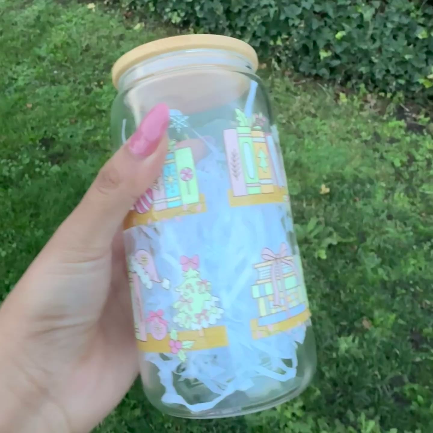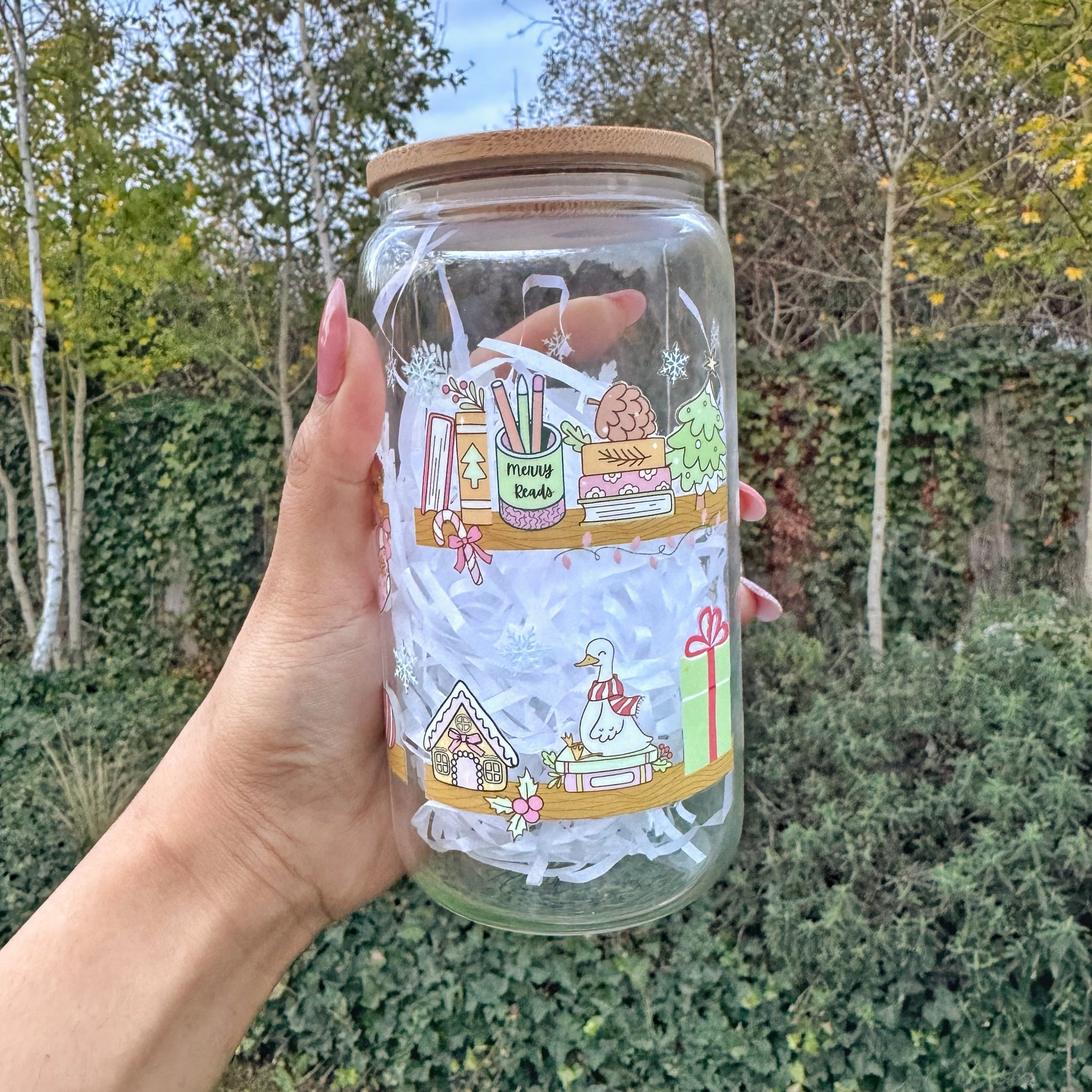 Christmas Bookshelf Book Nook Iced coffee Glass Can With Bamboo Lid and Straw