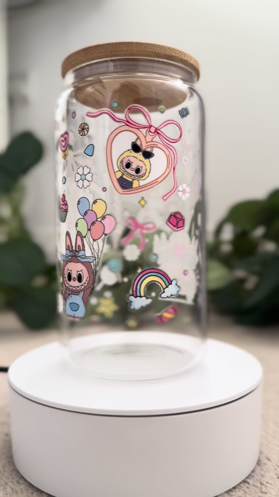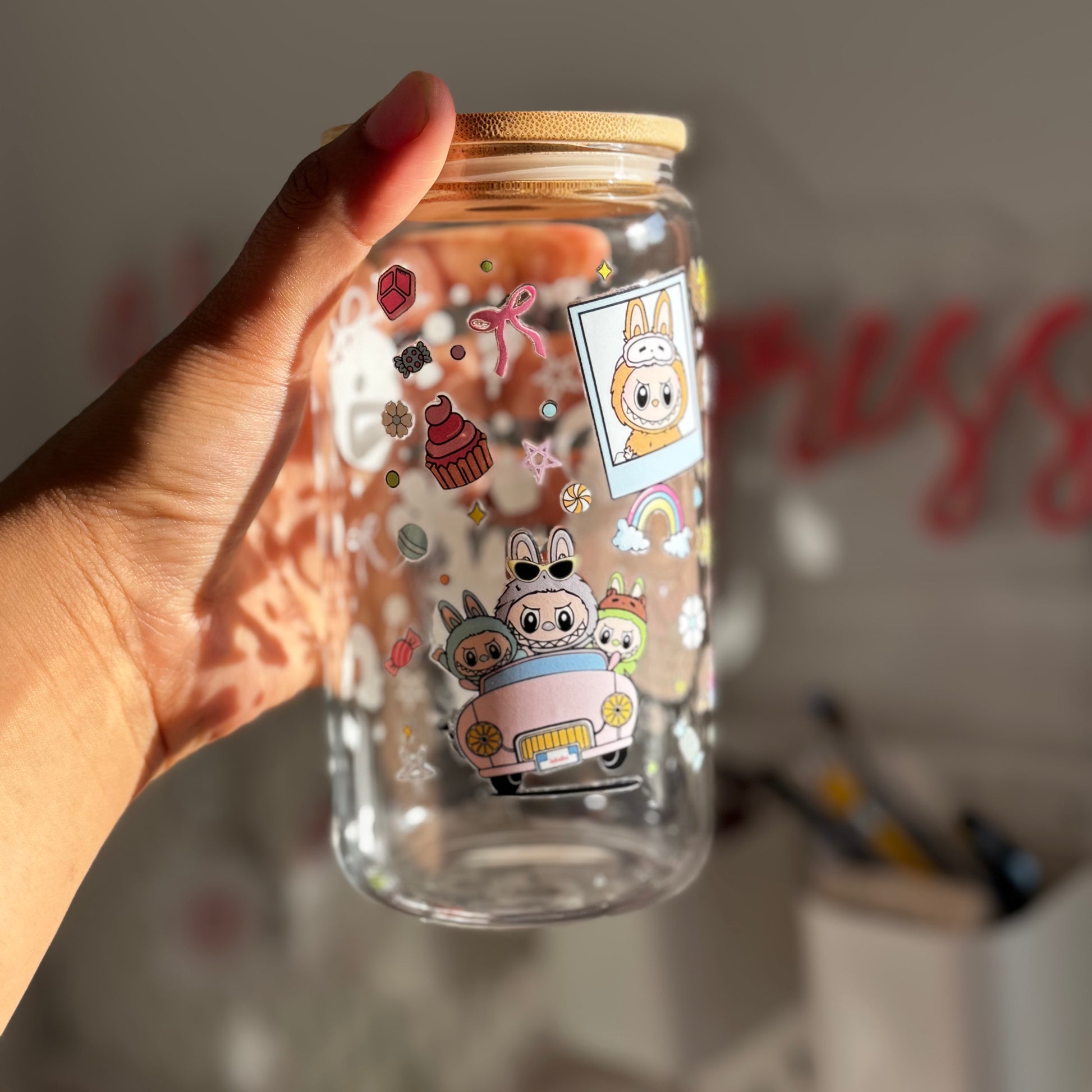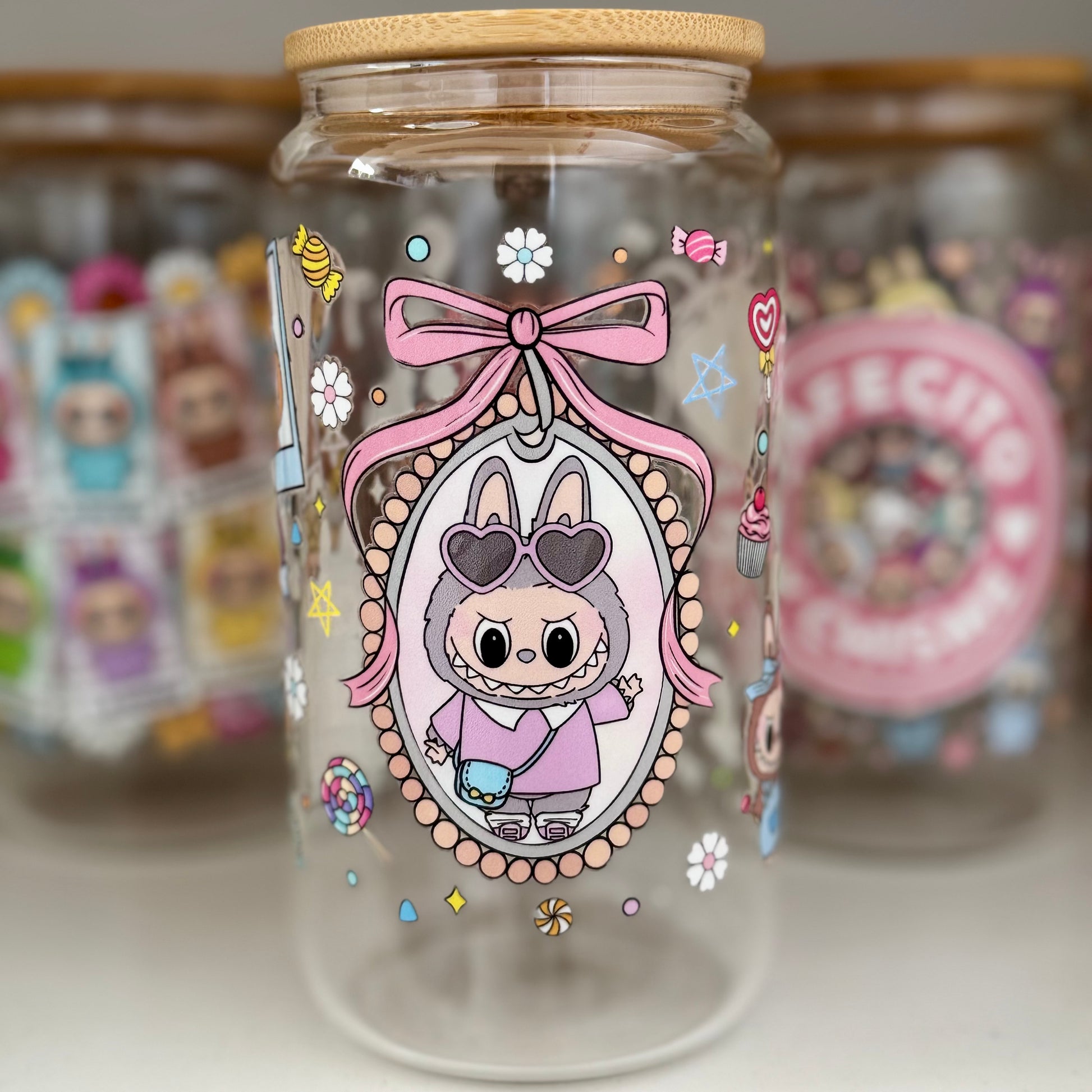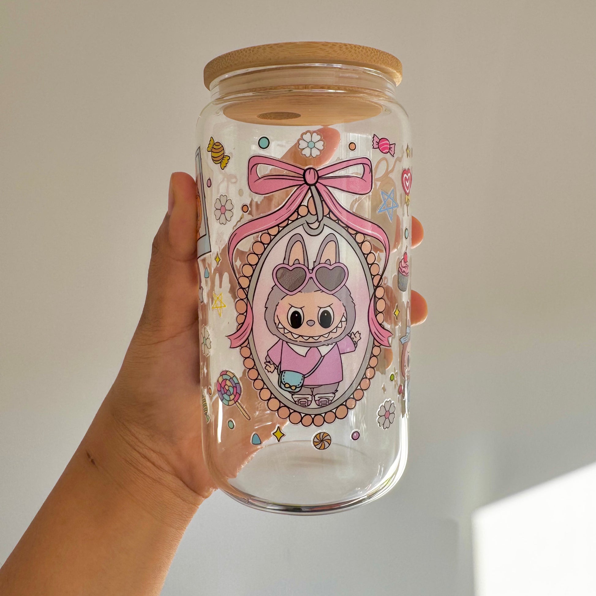 Exclusive Labubu Collection - Labubu Monster Doll iced coffee can, Labubu Libbey Glass with Bamboo Lid and Glass Straw