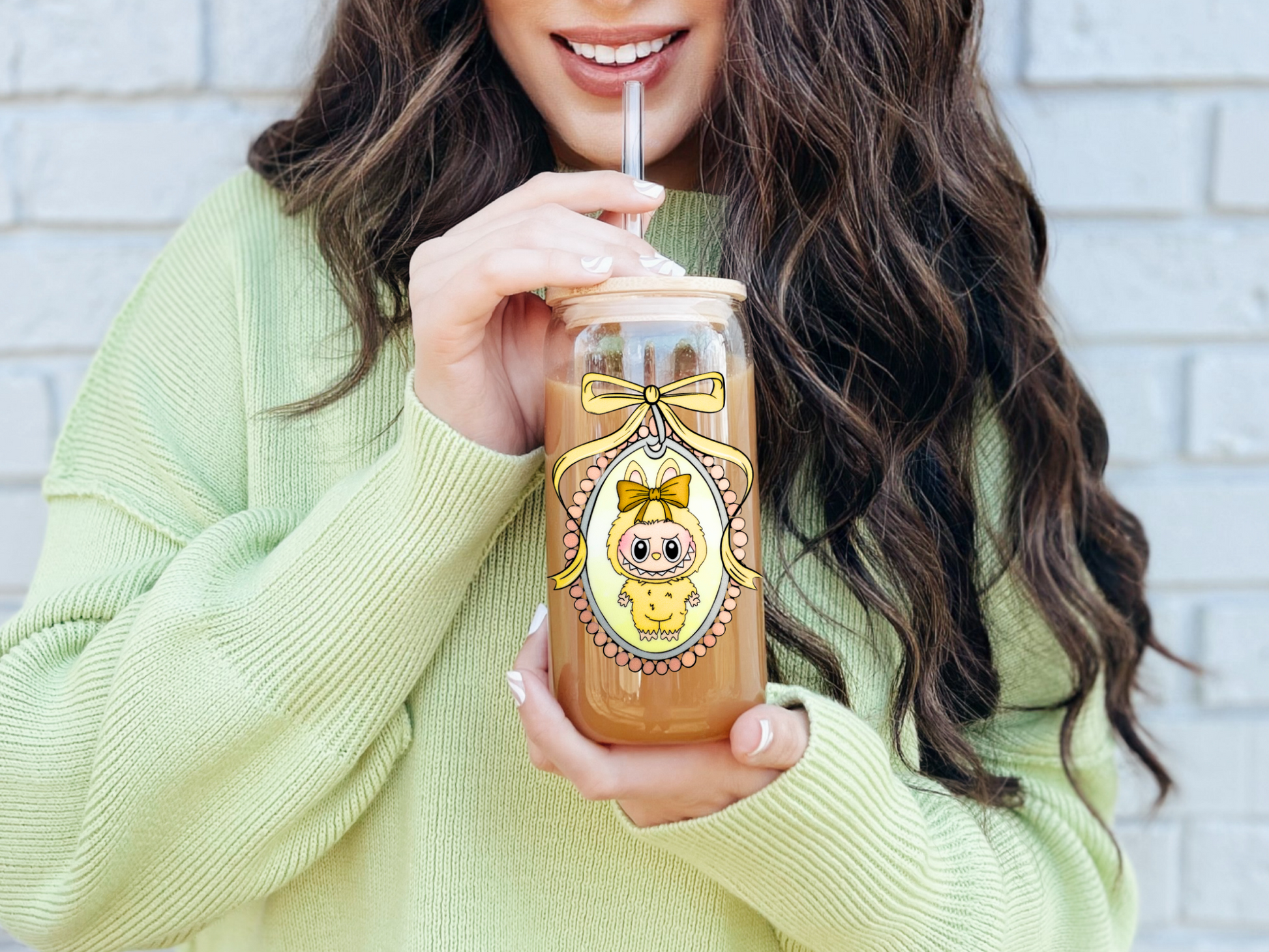 Exclusive Labubu Collection - Labubu Yellow Soymilk (SiSi) iced coffee can, Labubu Libbey Glass with Lid and a Straw.