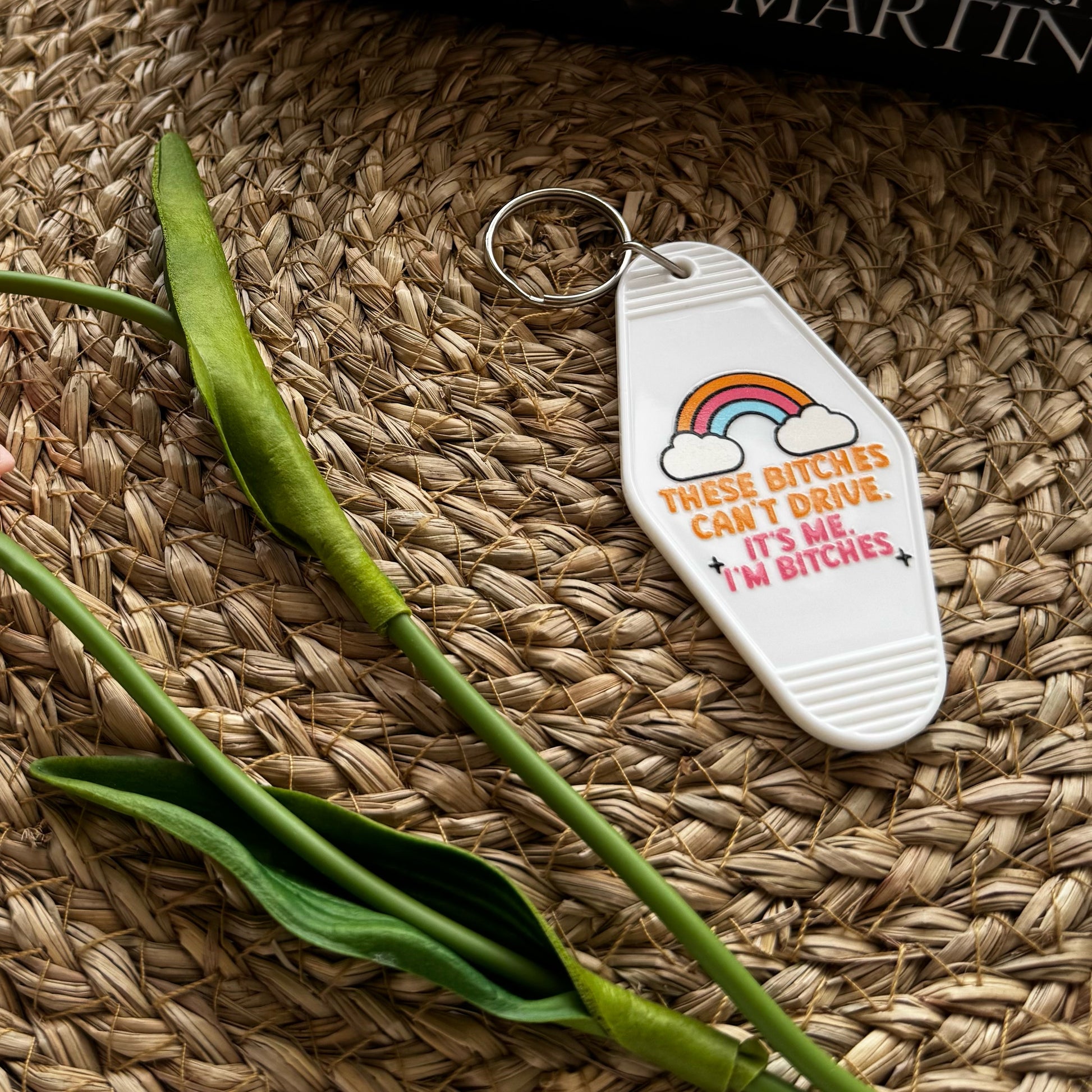 For the chaotic drivers and self-aware queens — this one's for you. Our "These bitches can’t drive. It’s me. I’m the bitches." retro motel keychain is the perfect mix of humor and honesty. Whether you’re hitting curbs or just embracing your not-so-perfect driving skills, this keychain says it all so you don’t have to.