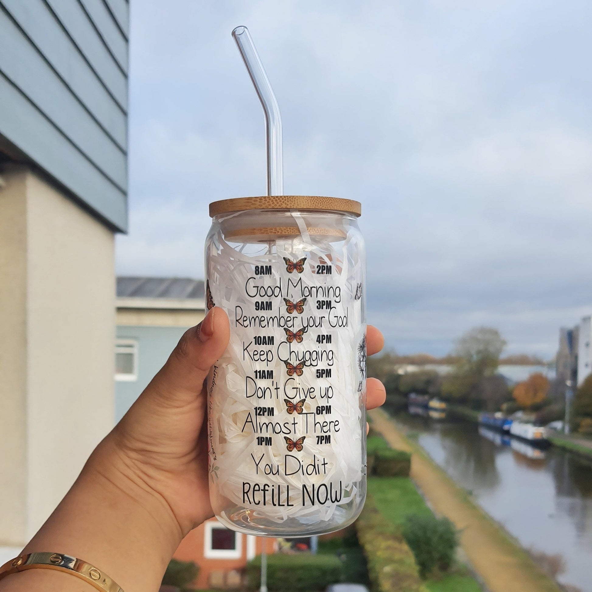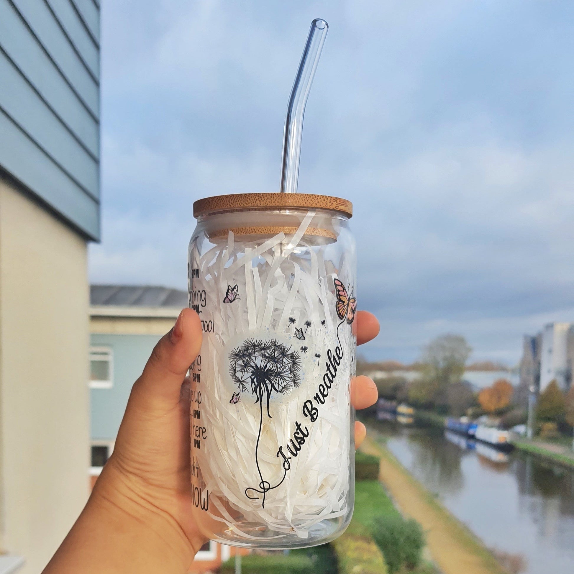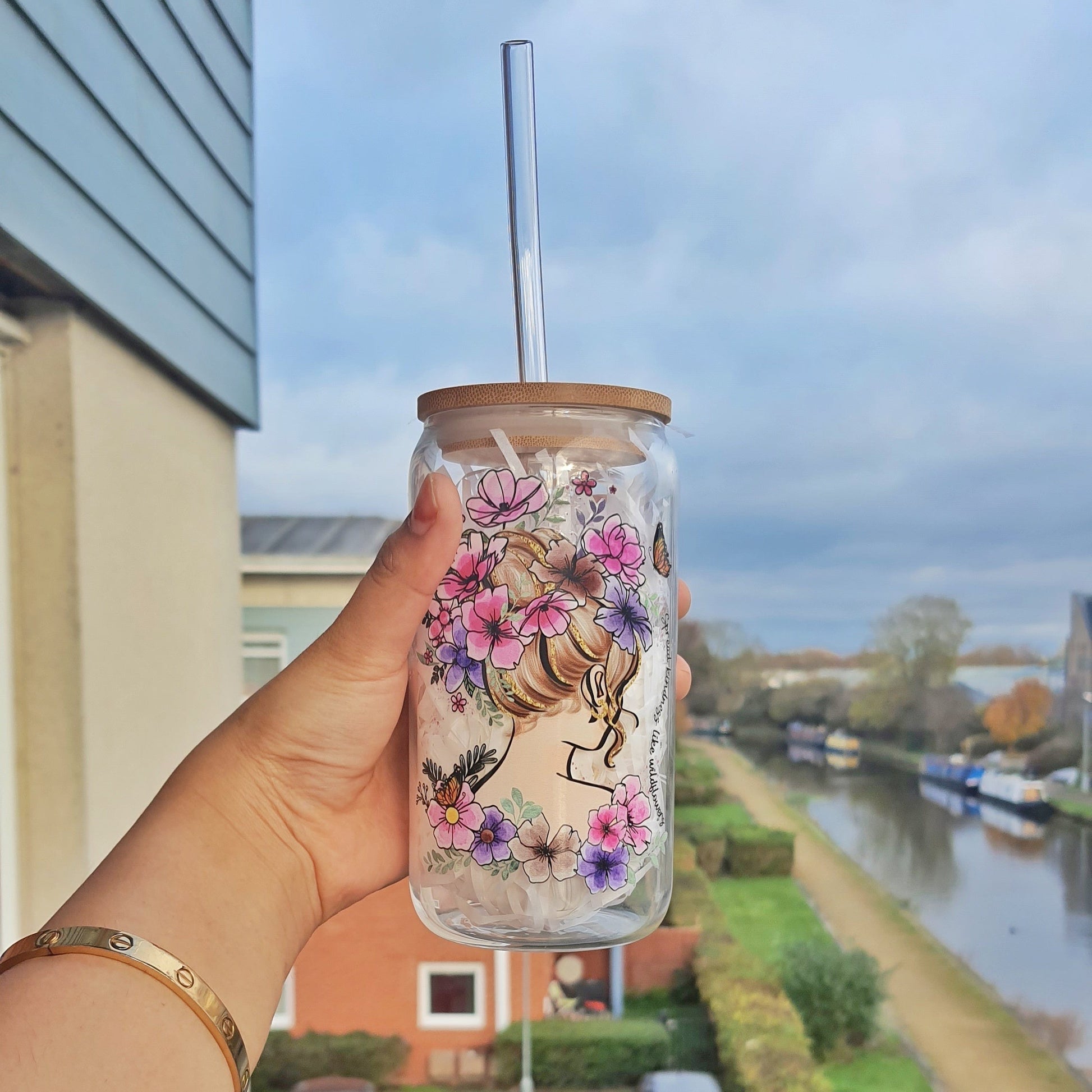 SALE affirmation Flower lady iced Coffee Cup, Flower Glass Tumbler 16 oz , Glass Cup with Bamboo lid and glass straw