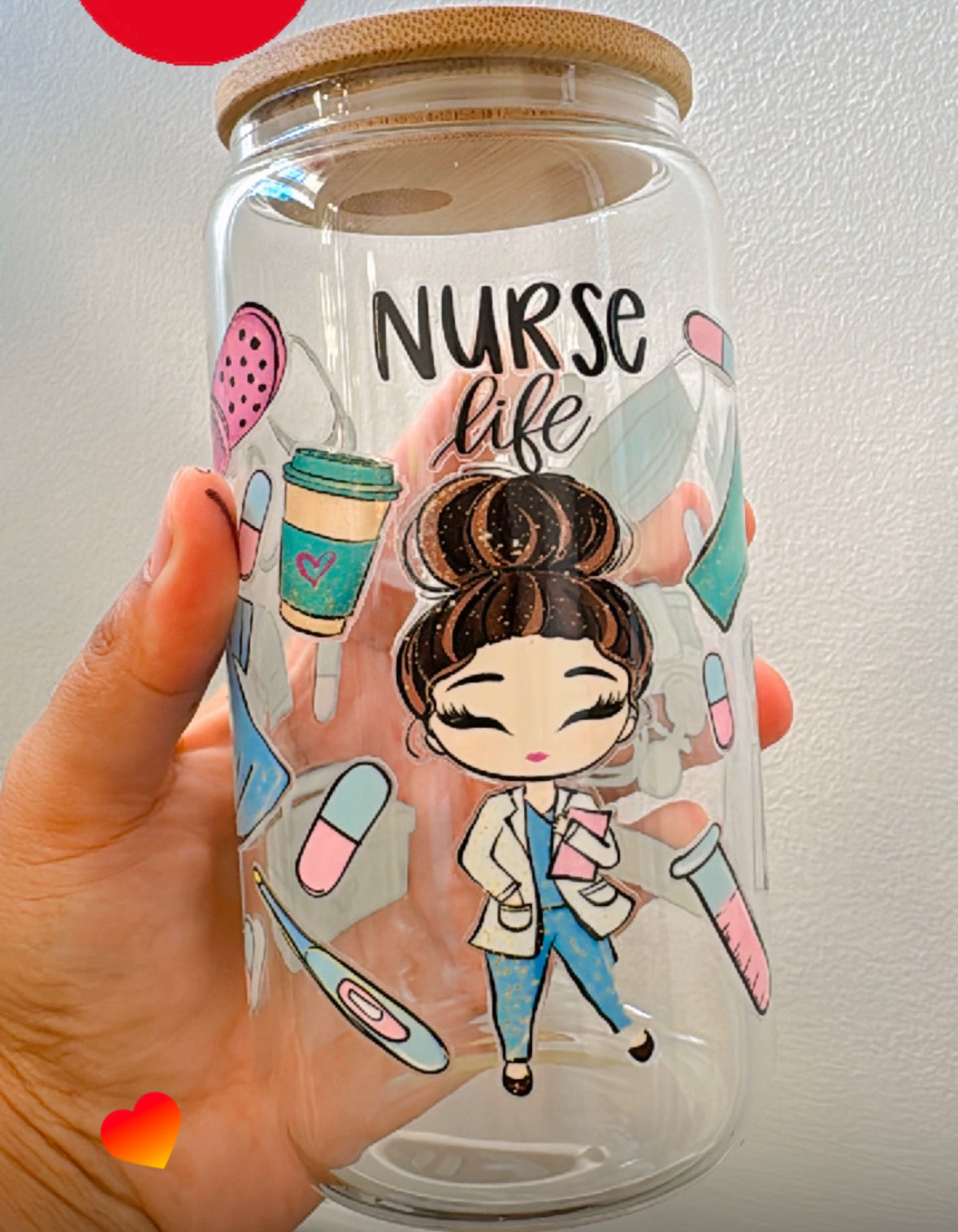 SALE Nurse iced Coffee Cup, Flower Glass Tumbler 16 oz , Glass Cup with Bamboo lid and glass straw